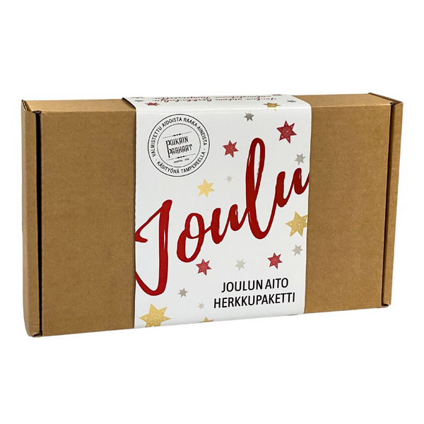 Paketti täynnä jouluisia tuotteita sesongin parhaimpiin herkkuhetkiin! Joulun aitoon herkkupakettiin sisältyy: Joulutee 50g, Joulukahvi 100g, Perinteinen Käsityöläisglögi 500ml sekä Joululimonaadi 330ml.