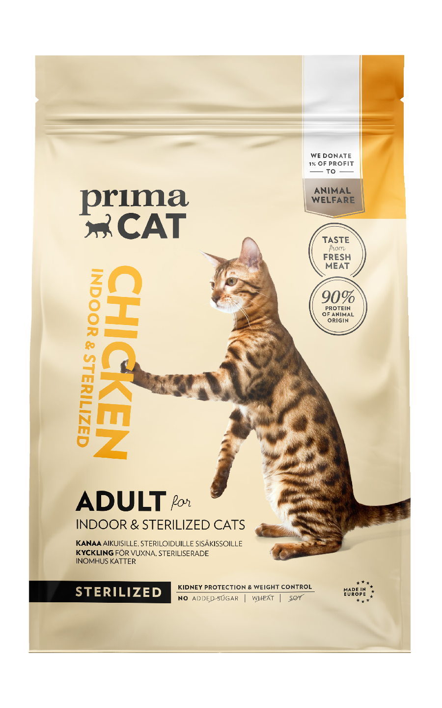 PrimaCat Kanaa aikuisille, steriloiduille sisäkissoille on houkuttelevan lihaisa täysravinto, joka on suunniteltu erityisesti steriloitujen kissojen tarpeisiin. Ruokaan on lisätty tuoretta kanaa, joka lisää ruoan houkuttelevuutta valikoivammankin kissan asteikolla. Kissan ruokkiminen on taitolaji, jossa kaikki keinot ovat sallittuja. Kananmakuinen ruokamme sopii kaikille kotikissoille, mutta se sisältää steriloidulle kissalle optimaaliset kivennäispitoisuudet esimerkiksi magnesiumin ja natriumin suhteen. Hieman tavanomaista ruokaa alhaisempi rasvapitoisuus auttaa säilyttämään kissasi linjakkaan olemuksen.