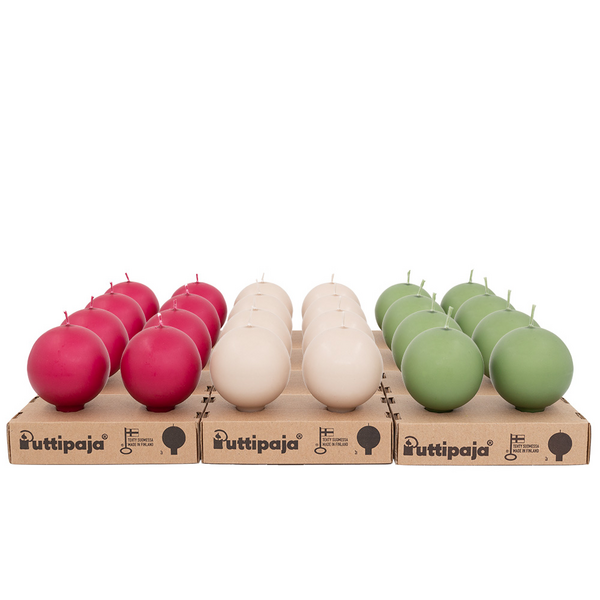 Laadukkaan parafiinin ja puuvillaisen sydänlangan ansiosta kannallinen pallokynttilä palaa kauniisti ja puhtaasti 12 tuntia. Tässä lajitelmassa on 12 kahden kynttilän pakkausta. Väreinä ovat viini, puuteri ja sammal.