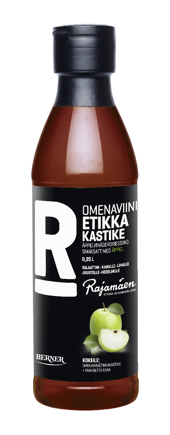 GluteenitonKäyttövalmis, raikkaan omenaisen makuinen Omenaviinietikkakastike soveltuu niin maustamiseen, marinadeihin kuin glaseerauskastikkeeksi. Kastike sopii myös käytettäväksi sellaisenaan maustekastikkeena esimerkiksi hedelmien tai juustojen kanssa. Kastike saa makua reseptin pohjana olevasta omenaviinietikasta ja omena-aromista. Öljytön, maidoton, laktoositon ja gluteeniton kastike soveltuu monenlaisille ruokavalioille. Avattu pakkaus säilytetään jääkaapissa. Katso reseptejä: www.rajamaen.fi