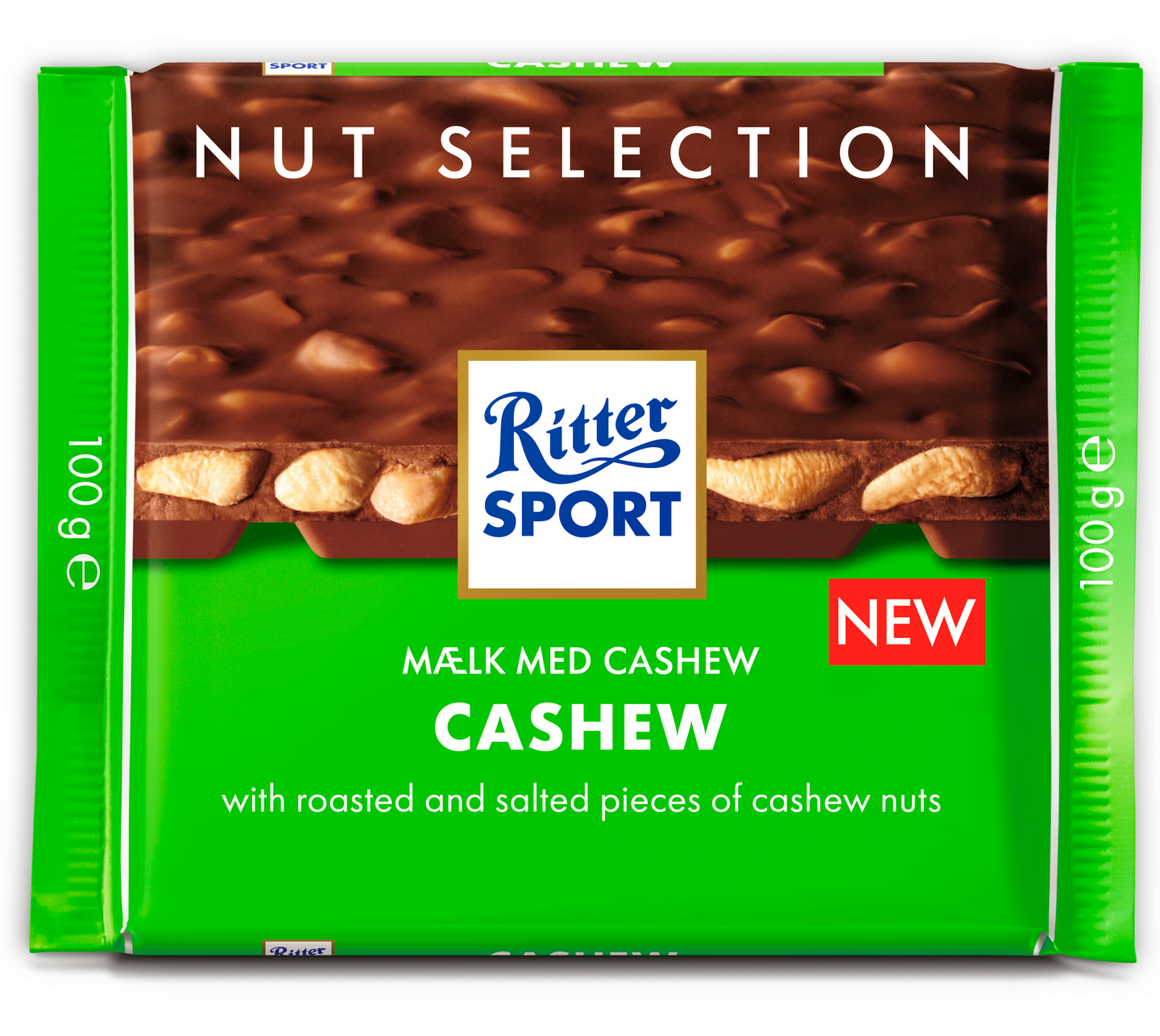 Yhdistelmä paahdettuja sekä suolattuja cashewpähkinöitä ja Ritter Sport -maitosuklaata maistuu herkulliselta.