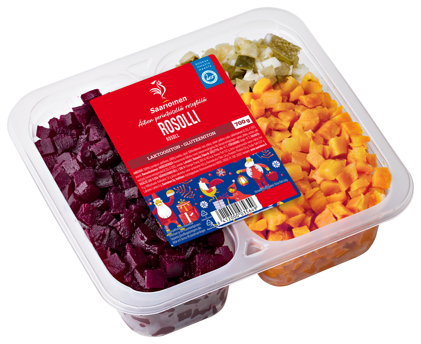VegaaninenValmistimme suositun rosollin huolella valituista punajuurista, porkkanoista, kurkuista ja sipuleista. Sijoittelimme raaka-aineet siististi pakkaukseen omiin lokeroihinsa, jotta sinä voit halutessasi sekoittaa ne itse. Rosolli on joulun kausituote. Vegaaninen. Sopii vegaaneille. Saarioinen on Suomen luotetuin valmisruokamerkki.