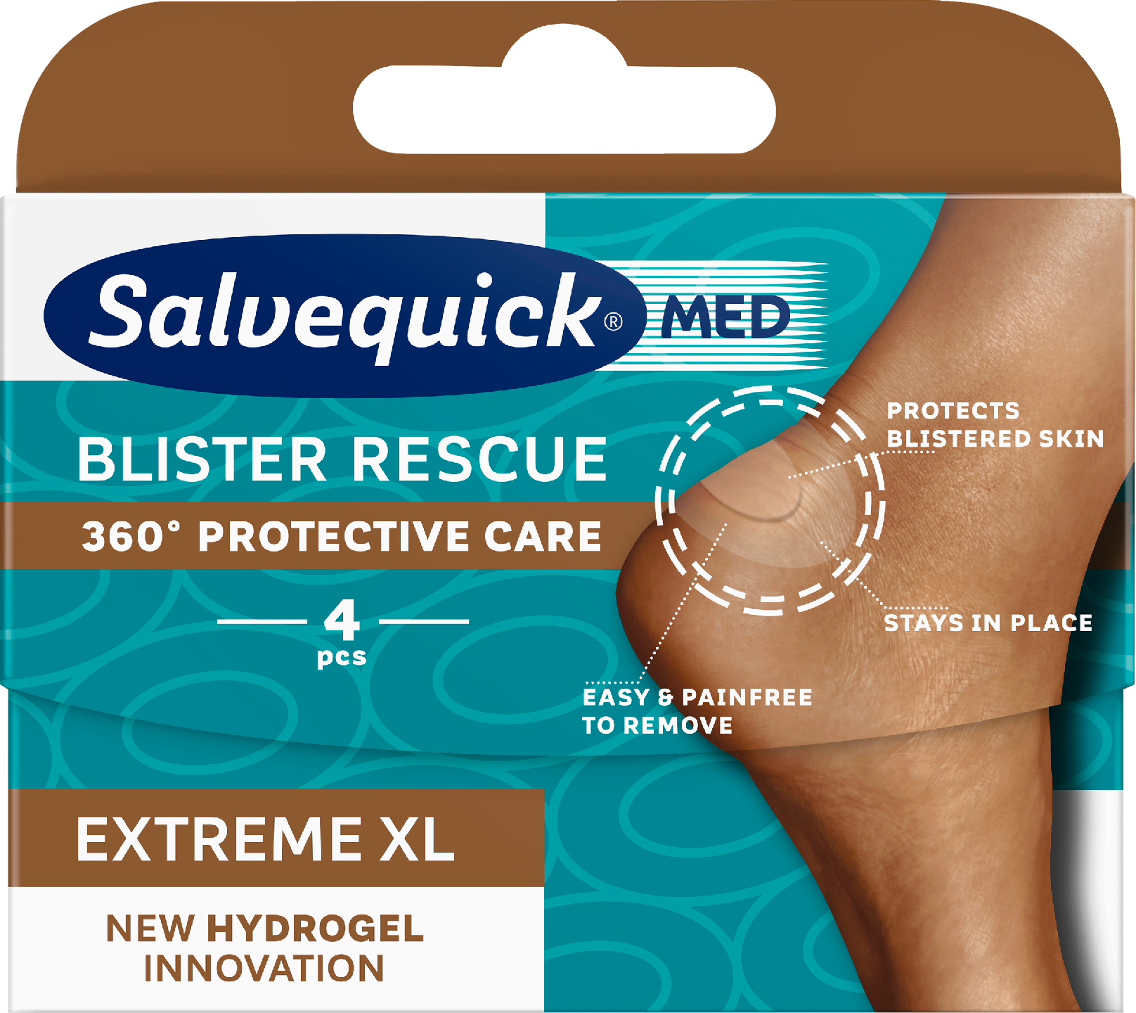 Salvequick Med Blister Rescue Extreme XL rakkolaastari on uusi innovatiivinen rakkolaastari. Siinä on hydrogeeliä sisältävä iso haavatyyny erityisesti kantapään isoille rakoille. Välitön kivun ja paineen helpotus pehmentävillä haavatyynyillä. Helppo poistaa vahingoittamatta hiertymää Hydrogel-haavatyynyjen kevyemmän liimatarttuvuuden ansiosta. Pysyy paikoillaan laastarin voimakkaan liimapinnan ansiosta. Nopeuttaa paranemista luomalla optimaalisen ympäristön haavan paranemiselle. Ominaisuudet varmistavat äärimmäisen mukavuuden ja joustavuuden. CE-merkitty lääkinnällinen laite. Valmistaja: Orkla Care AB.