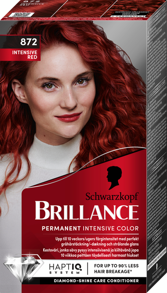 Schwarzkopf Brillance -hiusväri antaa hiuksillesi täydellisen ja kauniin kiiltävän värin jopa kymmeneksi viikoksi! Säteilevä väri syntyy hiusta suojaavalla HAPTIQ-teknologialla, joka suojaa hiusta 80 % paremmin. Peittää harmaat täydellisesti. Säteilevän kaunis väri 872 Intensive Red Pakkaus sisältää: Brillance color creme -värivoide 60 ml Kehite-emulsiopullo 60 ml Hoitoaine 40 ml Suojakäsineet Käyttöohje