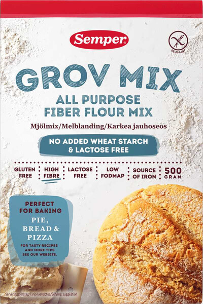 LaktoositonSemper gluteeniton Karkea jauhoseos Grov Mix on runsaskuituinen gluteeniton yleisjauho leipien ja suolaisten leivonnaisten leivontaan sekä kuitupitoisten makeiden leivonnaisten leivontaan. Semper jauho sopii pizzajauhoksi, piirakkajauhoksi ja sämpyläjauhoksi. Ei sisällä vehnätärkkelystä. Maidoton ja munaton. Sopii low FODMAP -ruokavalioon.