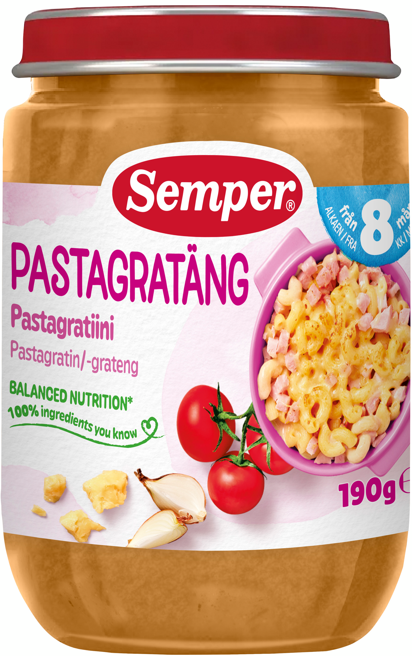 Semper Pastagratiini kinkulla ja juustolla on terveellinen ja herkullinen pienten lasten ruoka. Sisältää 50 % vihanneksia, kuten tomaattia, porkkanaa ja sipulia. Ateria sopii lapsille noin 8 kuukauden iästä alkaen. Sisältää sopivia pieniä paloja lapselle, joka opettelee pureskelemaan ruokaansa. Kahdeksan kuukauden ikäisille tarkoitettuja aterioita on maustettu hieman monipuolisemmin verrattuna 6 kuukauden ikäisten aterioihin. Kun lapsi tottuu miedosti maustettuihin aterioihin, hänen on helpompi siirtyä noin vuoden ikäisenä syömään samaa ruokaa muun perheen kanssa. Kaikki Semper lastenruoka on valmistettu ilman lisättyä suolaa, sokeria tai säilöntäaineita.