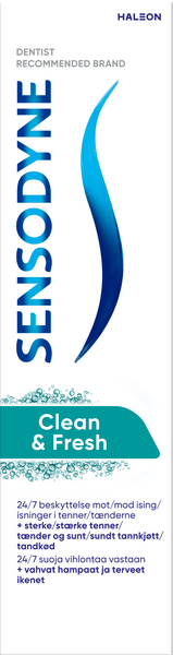 Sensodyne Clean & Fresh on päivittäiseen käyttöön tarkoitettu hammastahna, joka kahdesti päivässä käytettynä suojaa vihlontaa vastaan ja lievittää vihlontaa kliinisesti osoitetusti. Kahdesti päivässä käytettynä Sensodyne Clean & Fresh -hammastahna antaa ympärivuorokautista suojaa vihlontaa vastaa ja puhdistaa tehokkaasti. Sensodyne Clean & Fresh on päivittäiseen käyttöön tarkoitettu hammastahna, joka tehopuhdistaa ja raikastaa pitkäkestoisesti. Sisältää fluoria, joka vahvistaa hammaskiillettä ja ehkäisee reikiintymistä. Päivittäiseen käyttöön tarkoitetussa Sensodyne Clean & Fresh -tahnassa on raikas mintun maku. Käytä Sensodyne Clean & Fresh -hammastahnaa kahdesti päivässä, sillä se: • Antaa ympärivuorokautista suojaa vihlontaa vastaan • Poistaa plakkia ja sisältää reikiintymistä ehkäisevää fluoria • Saa suun tuntumaan pitkään puhtaalta ja raikkaalta.