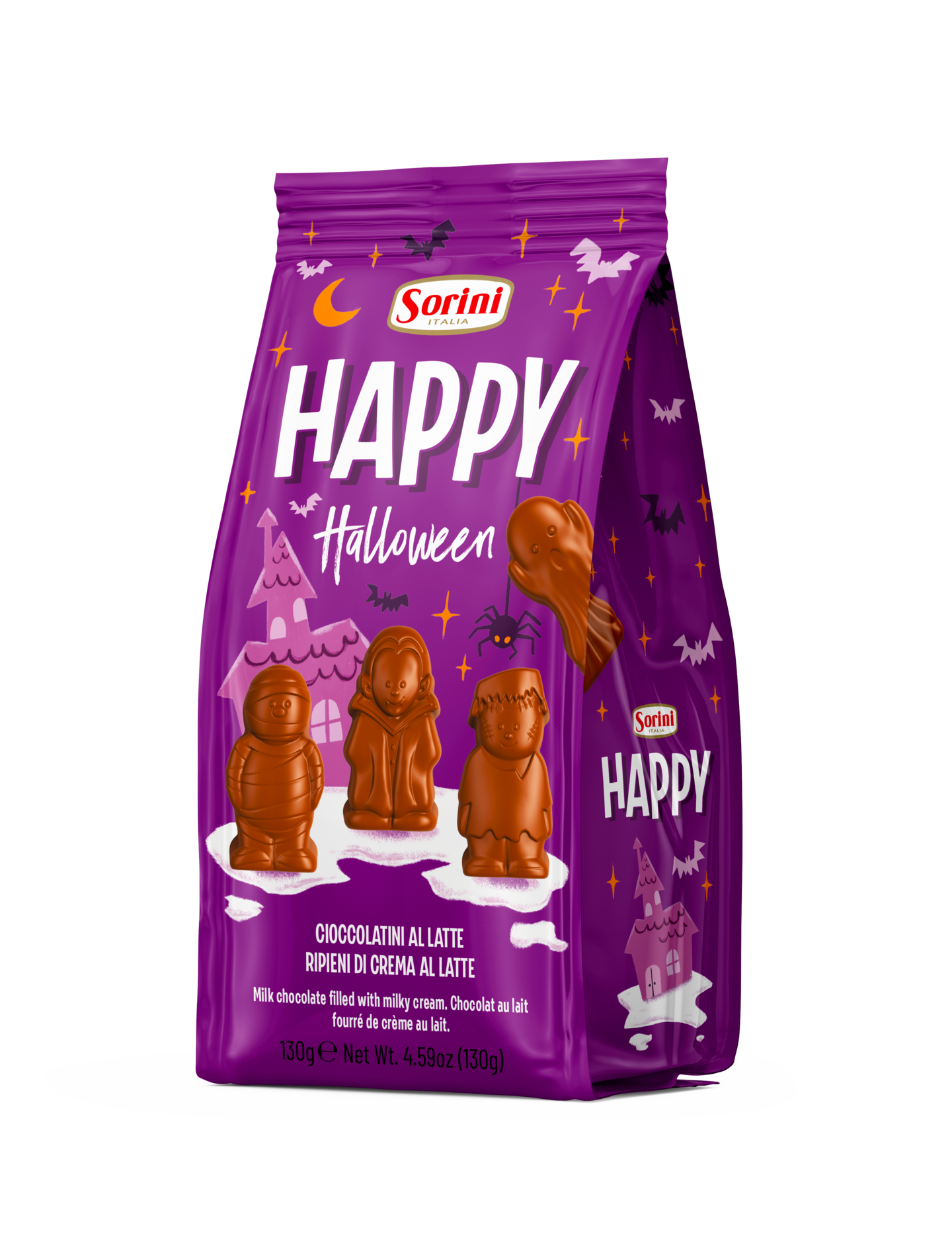 Herkullista italialaista maitosuklaata maitotäytteellä. Pakkauksessa yksittäispakattuja suklaahahmoja jaettavaksi: Frankenstein, haamu, muumio ja vampyyri!