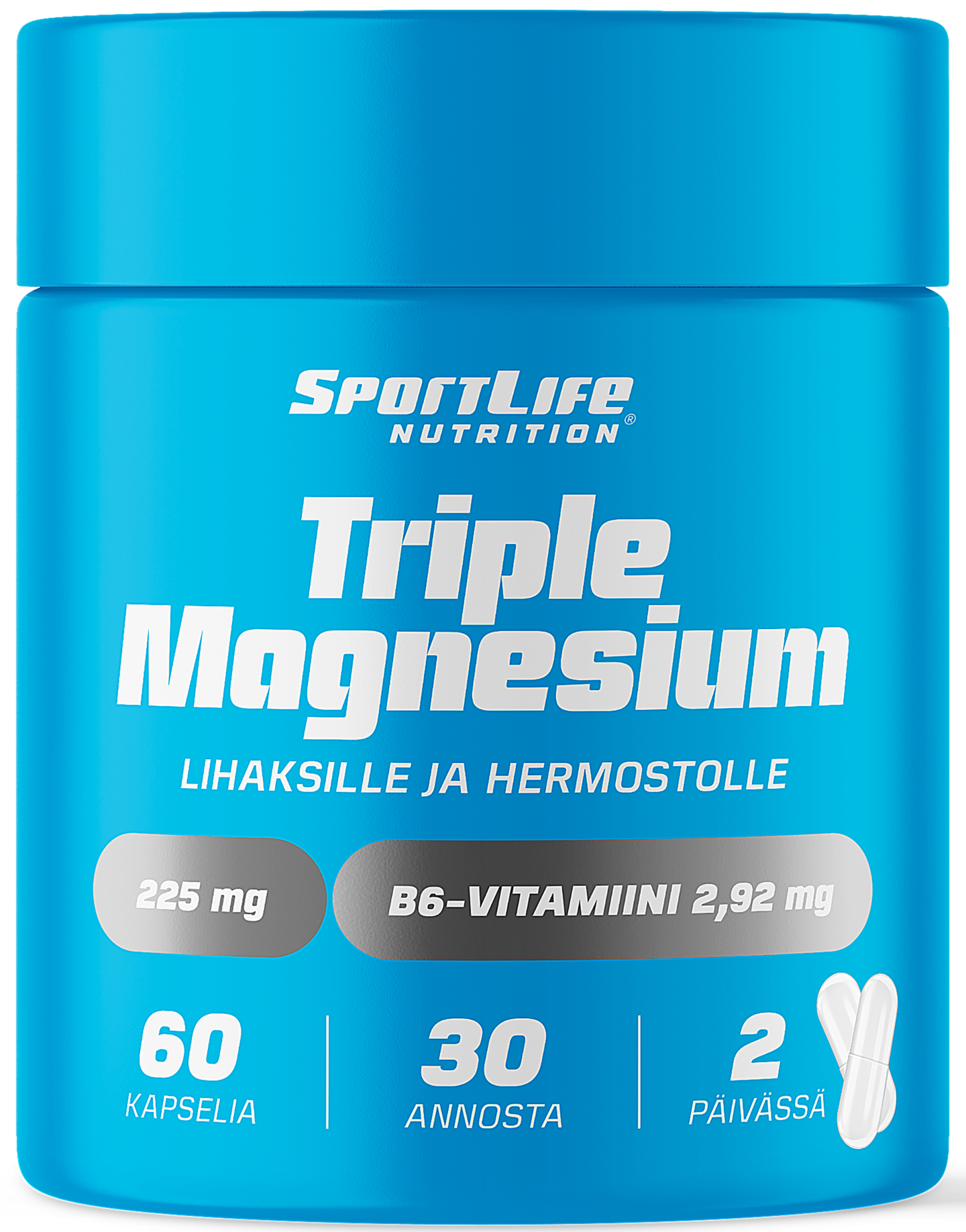 SportLife Nutrition® Triple Magnesium sisältää kolmea todella laadukasta magnesiumin muotoa: magnesiumsitraattia -glysinaattia ja -malaattia. Triple Magnesium tukee lihasten ja hermoston normaalia toimintaa sekä edistää luuston hyvinvointia. Suomessa kehitetty ravintolisä.
