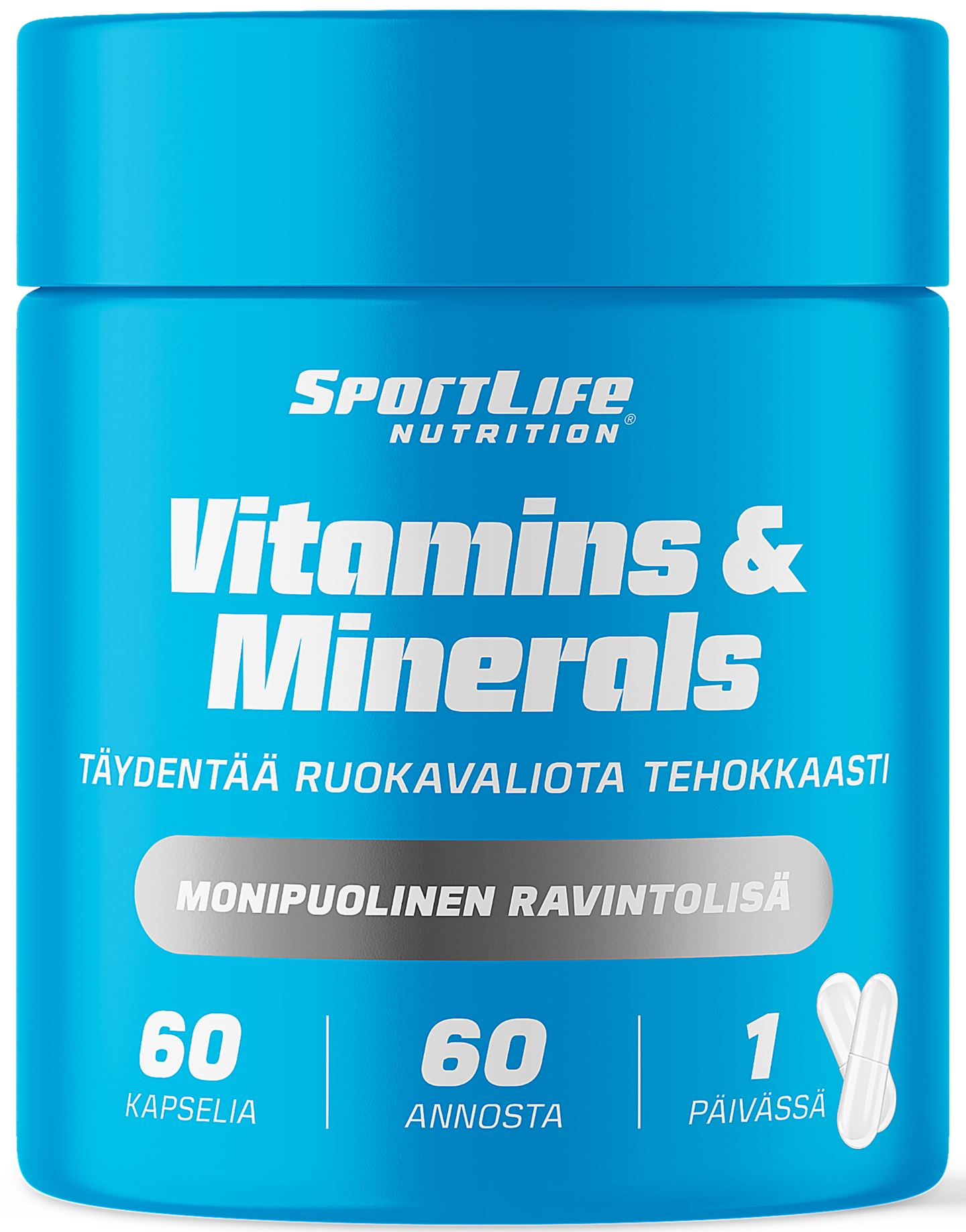 SportLife Nutrition® Vitamins & minerals sisältää runsaasti terveydelle tärkeitä vitamiineja ja mineraaleja. Vain yksi kapseli päivässä riittää täydentämään ruokavalion tärkeillä ravintoaineilla. Suomessa kehitetty ravintolisä.