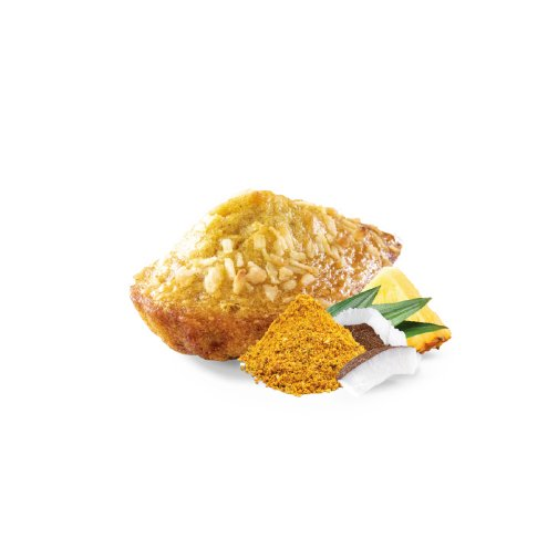 Rapsiöljy, VEHNÄJAUHO, KANANMUNA 24%, ananasvalmiste 6,7% (ananas, ruokosokeri, happamuudensäätöaine: sitruunahappo), tärkkelys, sokeri, kookosraaste 2,5%, nostatusaineet: difosfaatit ja natriumkarbonaatit (VEHNÄ), curry 1,1 % (paprika, kurkuma, pippuri, sarviapila, neilikka, kaneli, chilipaprika, kardemumma), luonnolliset aromit, suola, kookosmaitojauhe (kookosmaito, maissi ja/tai tapioka-maltodekstriini, MAITOPROTEIINIT), kuivatut yrtit (sipuli, persilja), kuivattu punainen paprika, auringonkukkaöljy, sitruunankuori. TUOTE SISÄLTÄÄ: GLUTEENI, MAITO, KANANMUNA. Tuote saattaa sisältää: selleri, pähkinä, sinapinsiemen, soija.