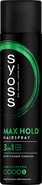 Syoss-hiustuotteet, jotka lanseerattiin Japanissa 45 vuotta sitten, on suunniteltu ammattimaiseen hiusten muotoiluun. Syoss-hiuskiinteen 3-in-1-koostumus muotoilee, hoitaa ja korjaa hiuksia ja tekee kampauksesta pitkäkestoisen ja hiuksista terveen näköiset. Koostumus sisältää pantenolin ja niasiiniamidin yhdistelmästä koostuvaa vitamiiniyhdistettä, joka vahvistaa hiusten rakennetta. Syoss Max Hold -hiuskiinne antaa intensiivistä, vahvaa pitoa ja hallittavuutta pitkäkestoisiin kampauksiin. Se pitää kampauksen ojennuksessa jopa 48 tunnin ajan ja antaa luonnollisen pidon. Erittäin voimakkaan pidon antava hiussuihke suojaa hiuksia kosteudelta jättämättä tahmeutta tai jäämiä. Helppo harjata pois.