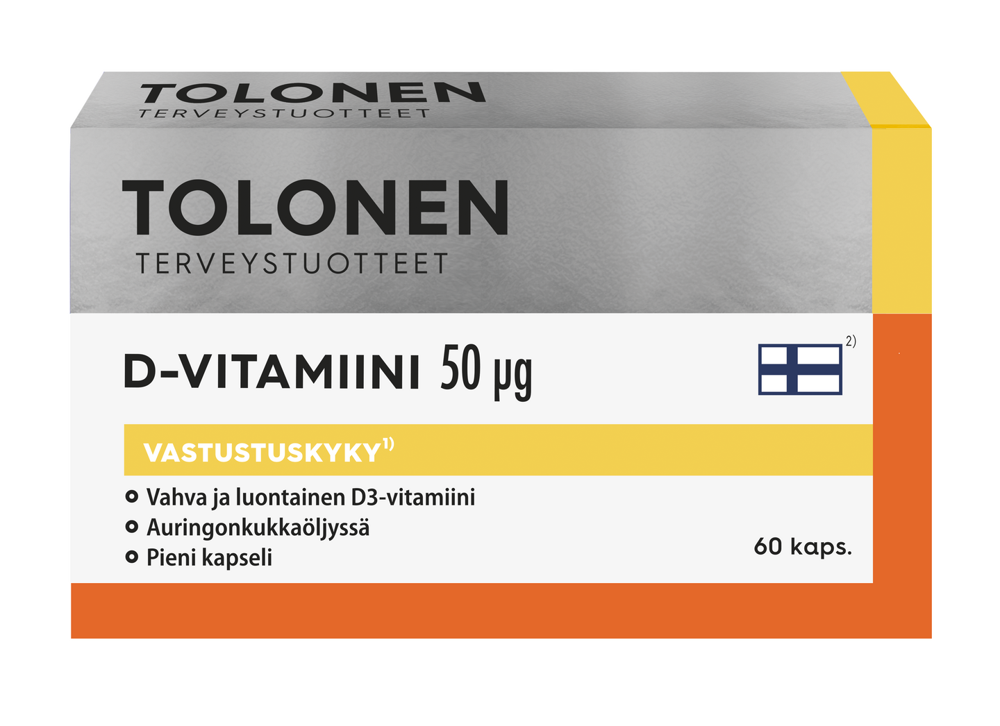 Vahva D-vitamiini päivittäiseen tarpeeseen! Tolonen D-vitamiini on auringonkukkaöljyssä ja D-vitamiini on luontaista D3-vitamiinia, joka on eristetty lampaanvillarasvasta. D-vitamiini edistää luiden pysymistä normaalina ja normaalin lihastoiminnan ylläpitämistä sekä immuunijärjestelmän normaalia toimintaa. Suositeltu vuorokausiannos 1 kapseli sisältää 50 µg D-vitamiinia ja kapseli on pieni ja helppo niellä. Tuote sisältää nautaliivatetta.Ravintolisä ei korvaa monipuolista ja tasapainoista ruokavaliota eikä terveitä elämäntapoja. Suomessa kehitetty ja valmistettu! Lajitteluohje: Ulkopakkaus pahviin, läpipainopakkaus sekajätteeseen.