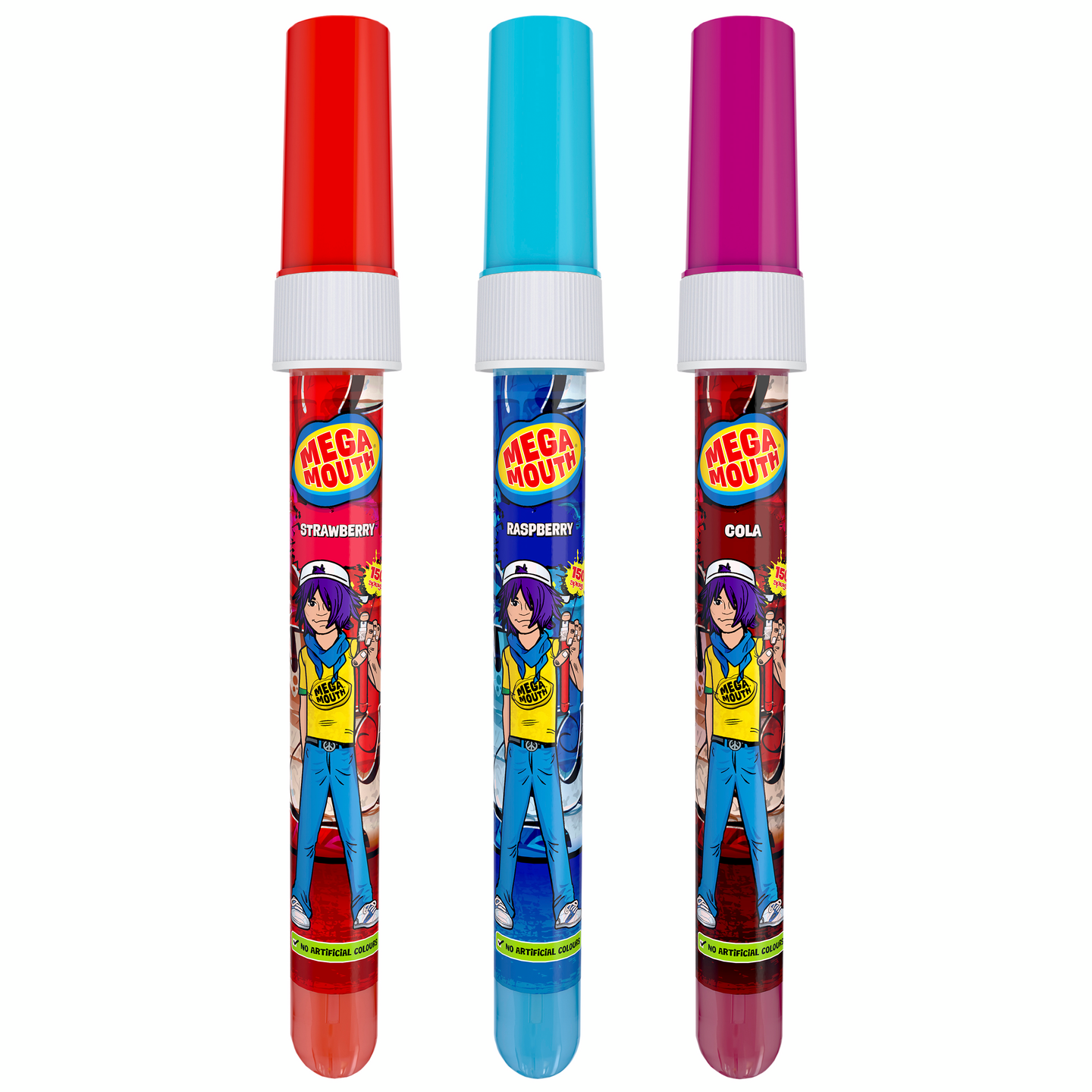 Bazooka Candy Brandsin makeiset ovat erikoismakeisia, joilla on helppo ilahduttaa niin omaa kuin ystävänkin päivää. Mega Mouth on maukas, kirpeä makeissuihke, jonka makuvaihtoehtoina löytyvät mansikka, vadelma ja cola. Mega Mouth on myös helposti otettavissa mukaan.