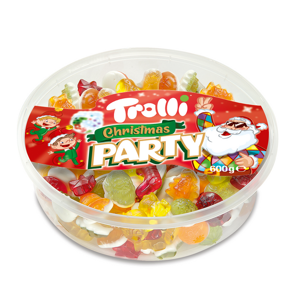 Kätevässä suljettavassa rasiassa sekoitus jouluaiheisia hedelmäviinikumimakeisia. Muotoina mm. joulupukki, tähti ja joulukello.