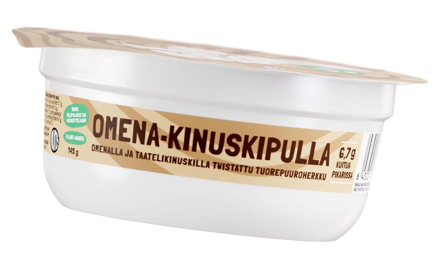 VegaaninenTwisted Oats on kaurapohjainen tuorepuuroherkku aamupalaksi, välipalaksi tai herkutteluun. Päällä moussemaista omenalla ja kanelilla twistattua tuorepuuroa, pohjalla herkullista taatelikinuskia. Tuunaa puuro tuoreilla marjoilla, pähkinöillä tai hedelmillä ja nauti hyvällä omallatunnolla. Ei lisättyä sokeria tai makeutusaineita, makeus vain hedelmistä. Valmistettu Suomen Savossa. 100% kasvipohjainen.
