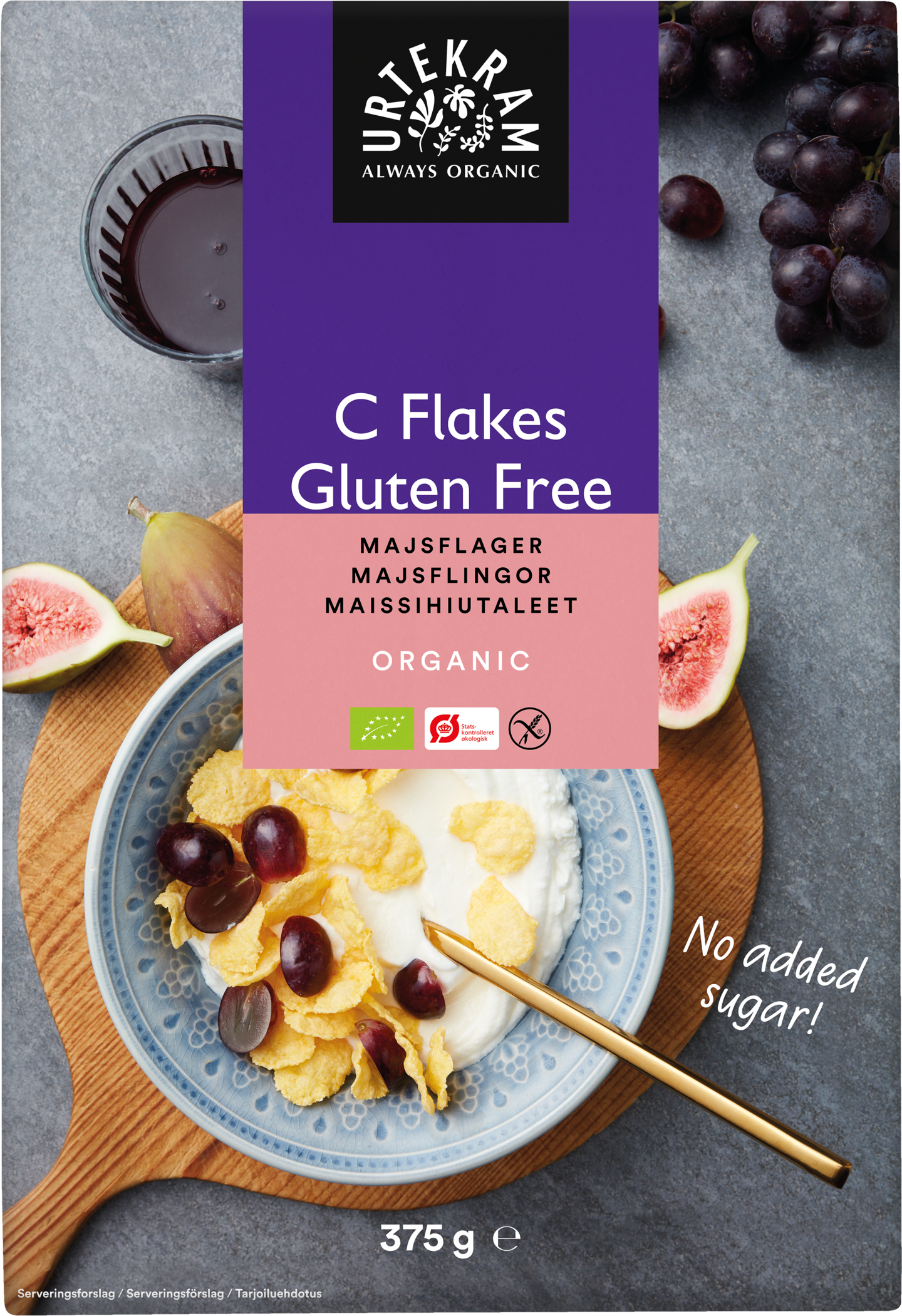 GluteenitonURTEKRAM® Gluteenittomat C-flakes ‑maissihiutaleet ovat kuin klassisia corn flakes ‑hiutaleita, mutta täysin gluteenittomia ja ilman lisättyä sokeria. Joten vaikka jostakin joutuu tinkimään, saa paljon sen tilalle. Maissihiutaleiden rapeus ja hyvä maku ovat koko perheen mieleen.