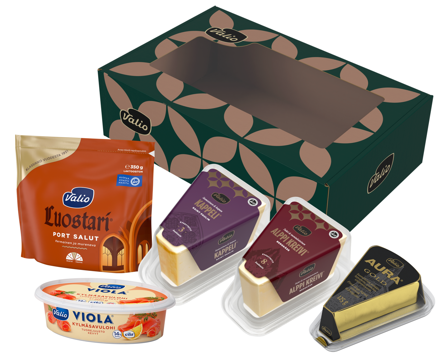 Juustoherkut-juustopakkaus on talven juustoisin lahja todellisille herkkusuille! Se on laadukas lahja, joka on helppo antaa. Sopii mainiosti myös tuliaiseksi. Lahjapakkaus sisältää viisi huolella valittua juustoa: Valio Luostari®, Valio Kappeli®, Valio Alppi Kreivi®, Valio AURA® Gold ja Valio Viola® kylmäsavulohi tuorejuusto. Juustojen seuraan sopivat esimerkiksi Valio glögi, piparit, hedelmät ja hillokkeet. Joulun 2025 kausituote.