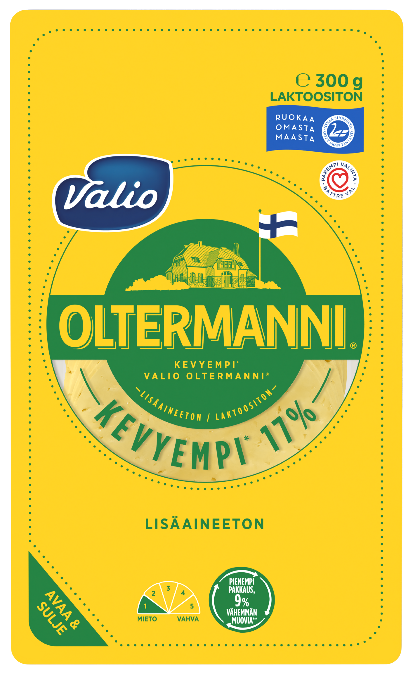 kermajuustoa, joka maistuu koko perheelle. Valmiista Valio Oltermanni® 17 % juustoviipaleista voileivät syntyvät helposti ja nopeasti. Vuodenvaihteessa 2020 Valio Oltermanni® 17 % viipaleille myönnettiin Sydänmerkki, joka kertoo niiden olevan suolan ja rasvan suhteen parempi valinta omassa tuoteryhmässään. Kaikki Valio Oltermanni® juustot valmistetaan suomalaisesta maidosta ilman lisä- ja säilöntäaineita.