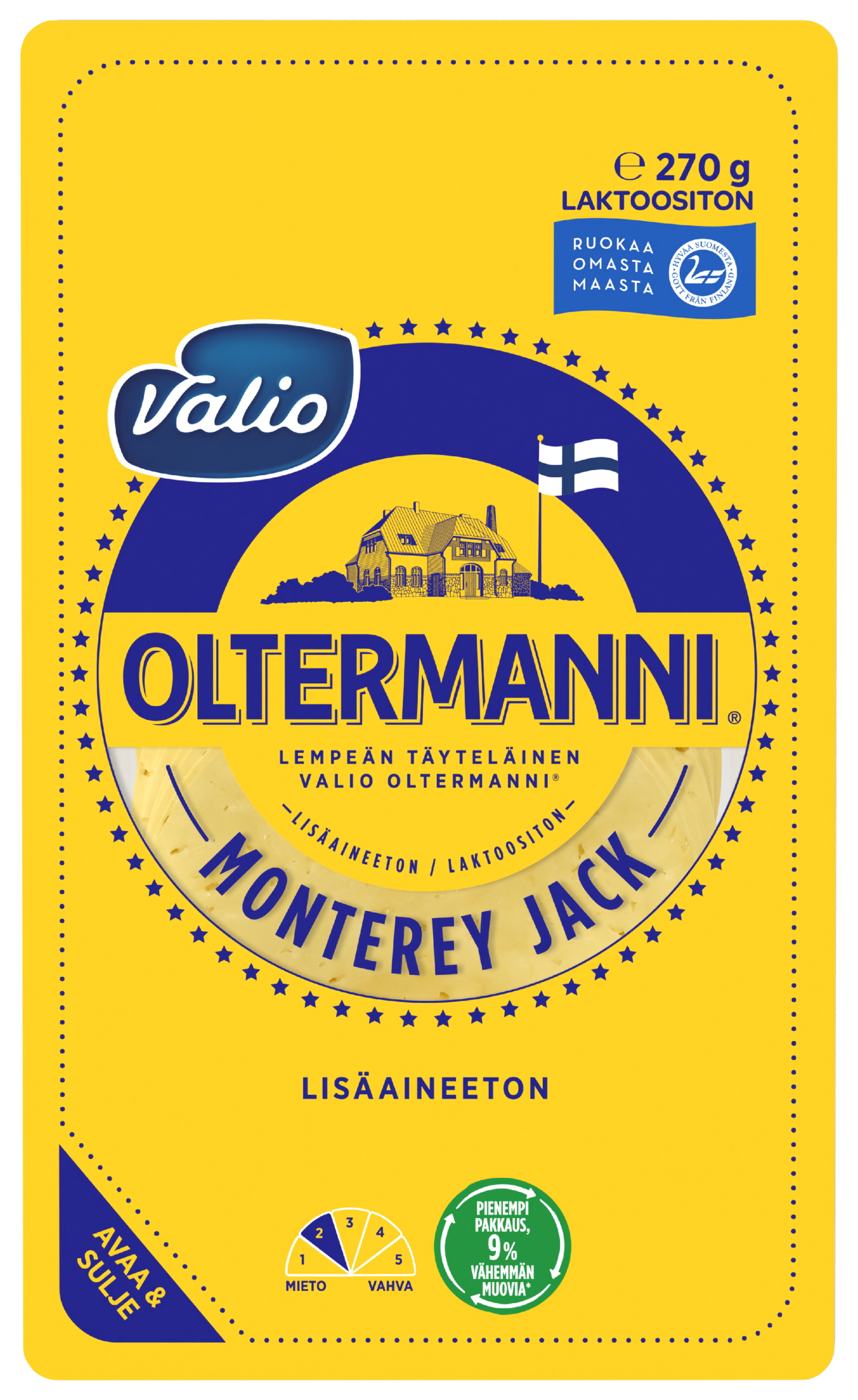 LaktoositonSuosittu Valio Oltermanni® Monterey Jack nyt myös viipaleina! Lempeän täyteläinen kermajuusto on saanut inspiraationsa amerikkalaisten suosikkijuustosta. Nauti leivän päällä tai kokeile hyvin sulavaa Monterey Jackia toasteihin, burgereihin ja lämpimien ruokien kuorruttamiseen! Kaikki Valio Oltermanni® juustot valmistetaan suomalaisesta maidosta eivätkä ne sisällä lisäaineita.