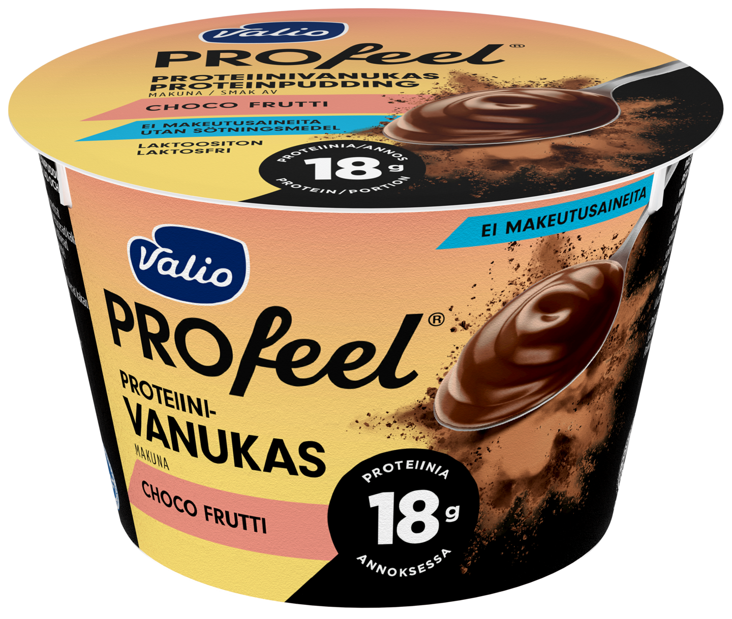 LaktoositonSalipäivä, vanukaspäivä! Valio PROfeel® proteiinivanukas choco frutti on suklaan ja persikan makuinen herkkuvanukas treenipäiviin. Pehmeää täyteläisyyttä, runsaasti proteiinia ja herkullista makua ilman makeutusaineita. Proteiinivanukas sopii myös täydellisesti hetkiin, jolloin haluat nautiskella terveellisemmin. Yksi vanukas sisältää 18 g laadukasta maitoproteiinia.