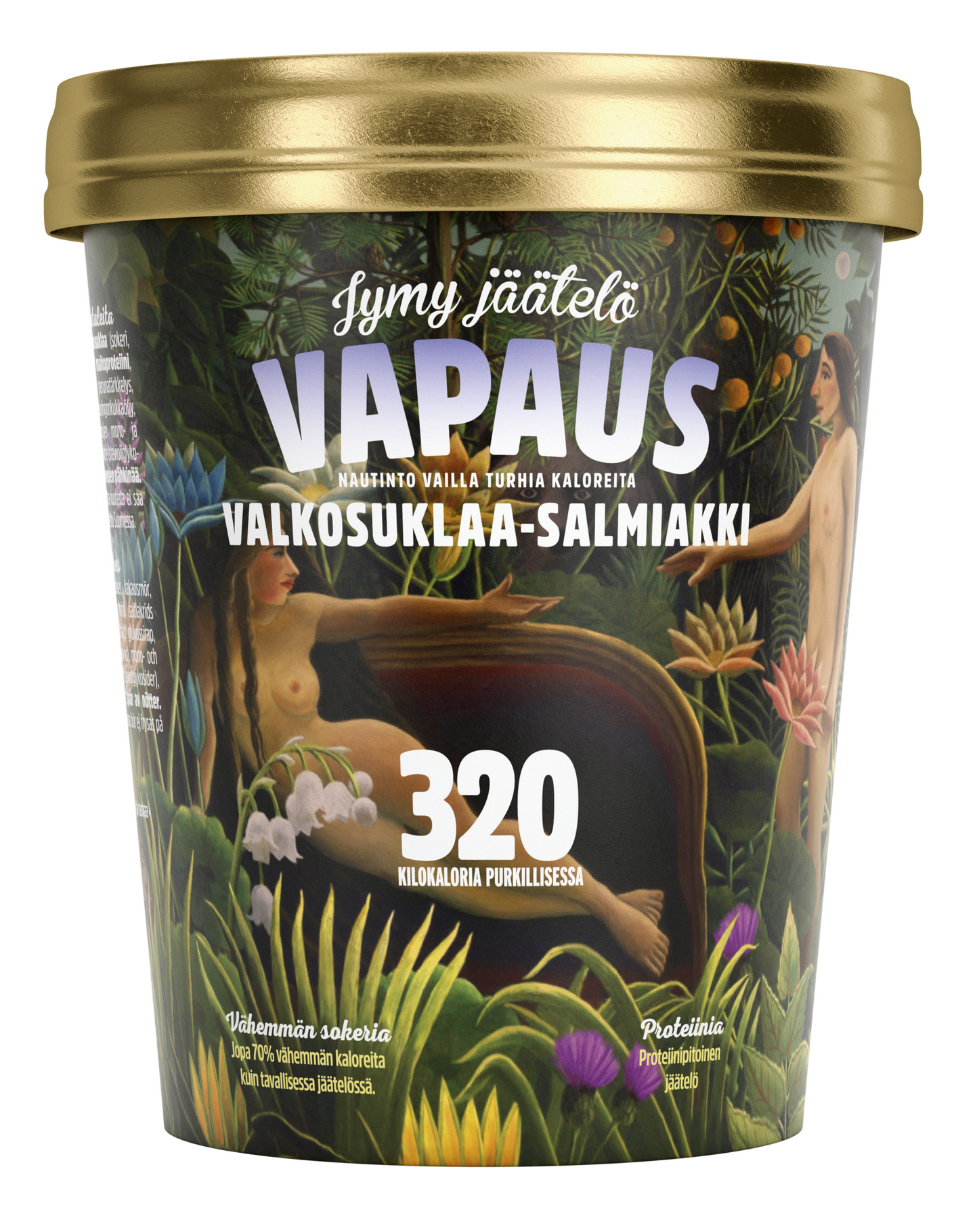 Laktoositon TÄYSMAITO, vesi, laktoositon valkosuklaa, inuliini, laktoositon MAITOJAUHE, erytritoli, salmiakkihiutale (sokeri, ammoniumkloridi, perunatärkkelys, lakritsiuute, tärkkelyssiirappi, aromit, kasviperäinen lääkehiili, auringonkukkaöljy, mehiläisvaha), glukoosisiirappi, rasvahappojen mono- ja diglyseridit, stabilontiaine (johanneksenleipäpuujauhe), suola, makeutusaine (stevioliglykosidit), vaniljajauhe. Tuote pastöroitu. SAATTAA SISÄLTÄÄ HIVENEN PÄHKINÄÄ. Gluteeniton. Laktoositon.