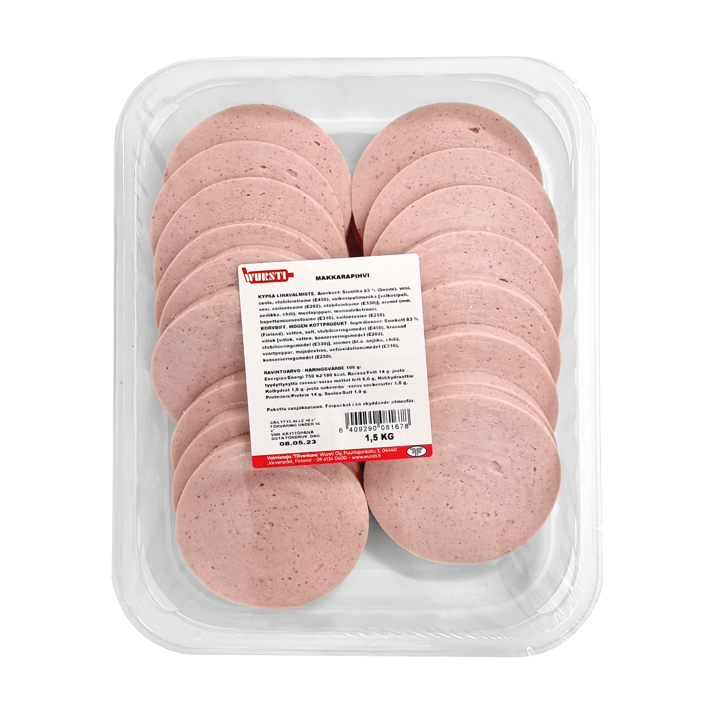 Sianliha 71 % (kasvatettu ja teurastettu: Eu), vesi, perunajauho, suola, mausteuutteet (chili, muskottipähkinä, pippuri), stabilointiaineet (E450, E451), hapettumisenestoaineet (E301, E316, E315), säilöntäaine (E250), aromit (mm. savu).